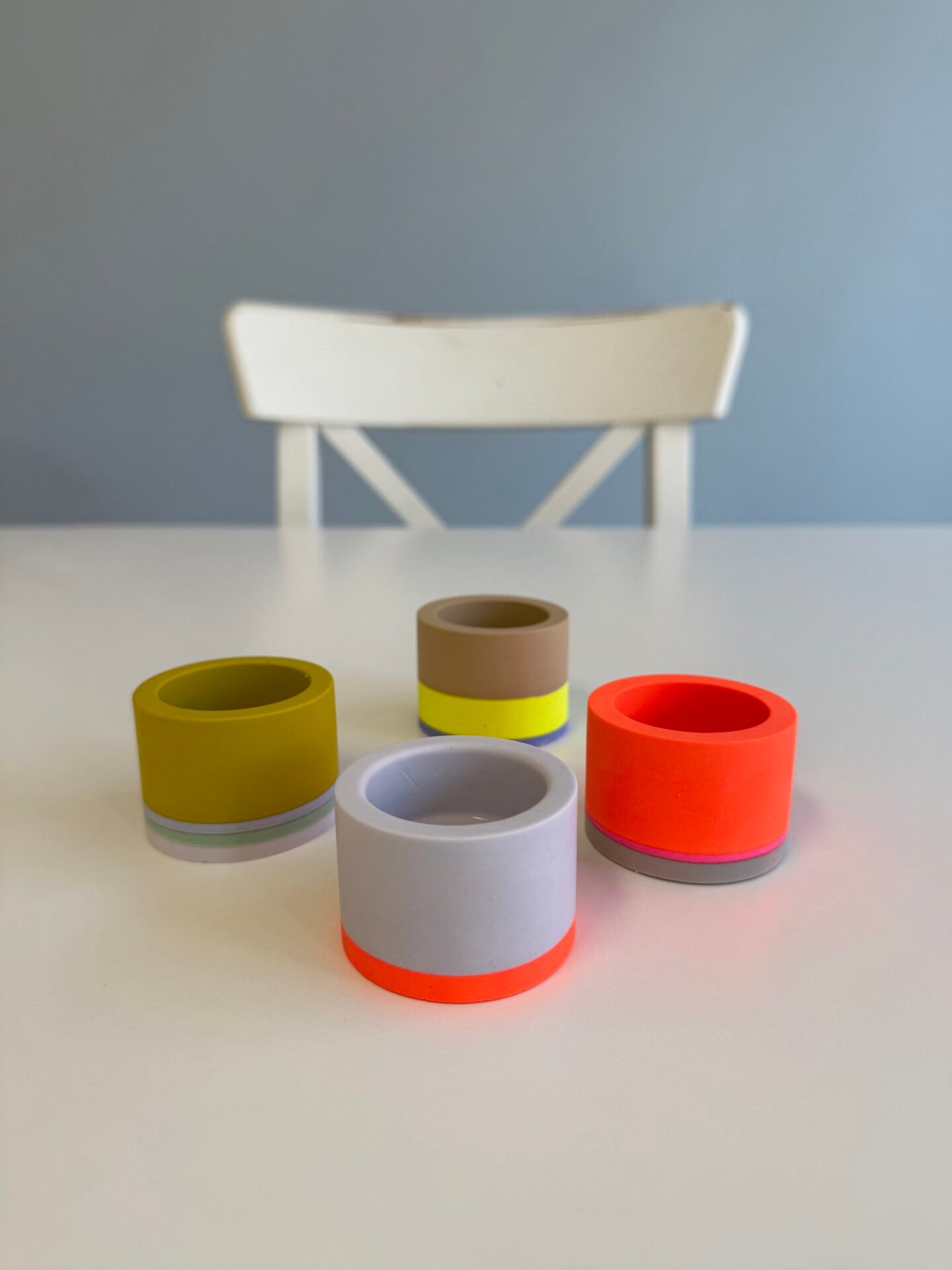 Ich arbeite mit Jesmonite AC100, einem Öko-Harz auf Wasserbasis. Es besteht aus einer Kombination von reaktivem Mineralpulver und Acrylharz auf Wasserbasis. Es fühlt sich an wie Stein, ist jedoch leichter und haptisch sowie visuell sehr hochwertig.