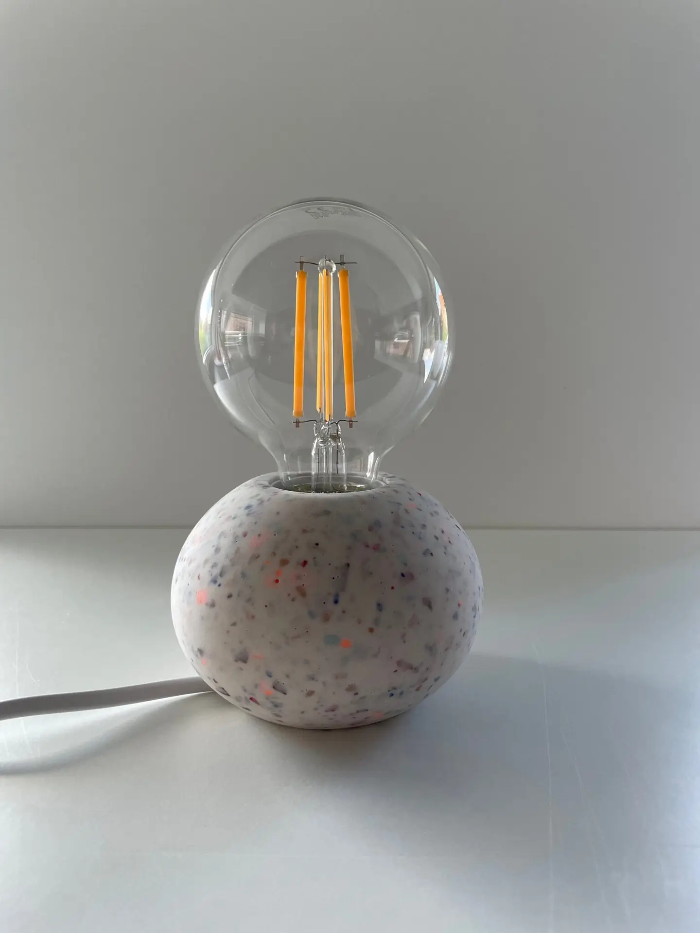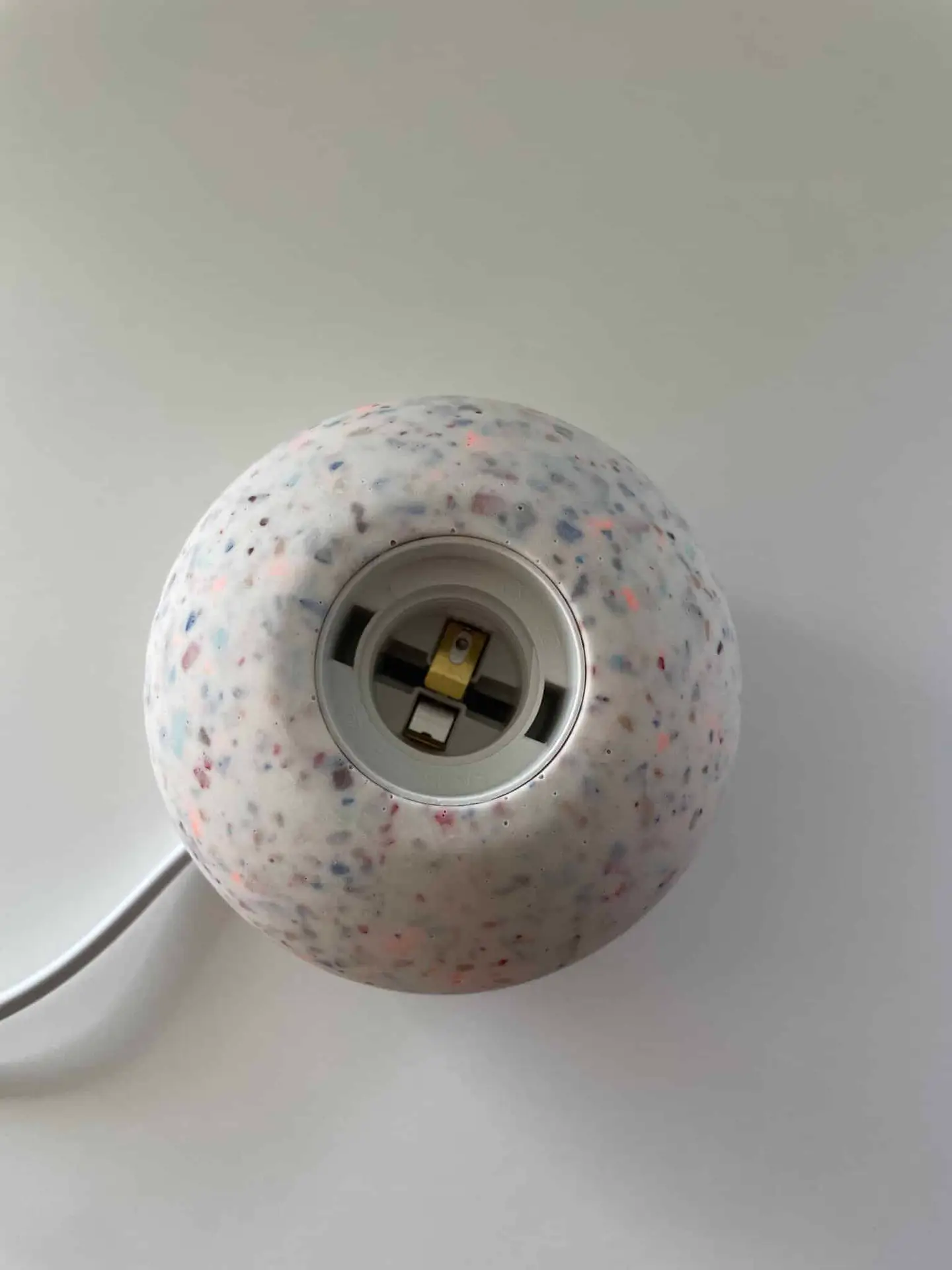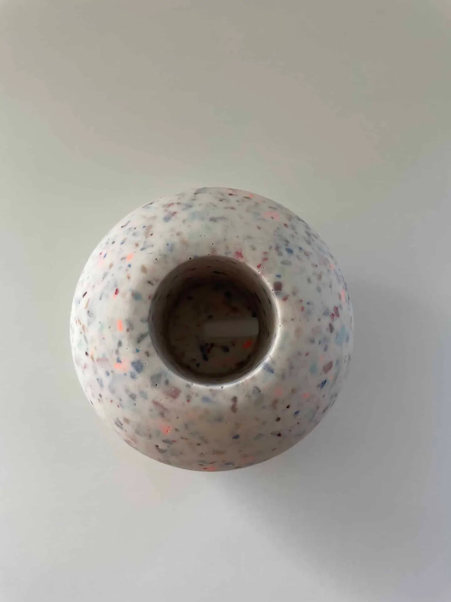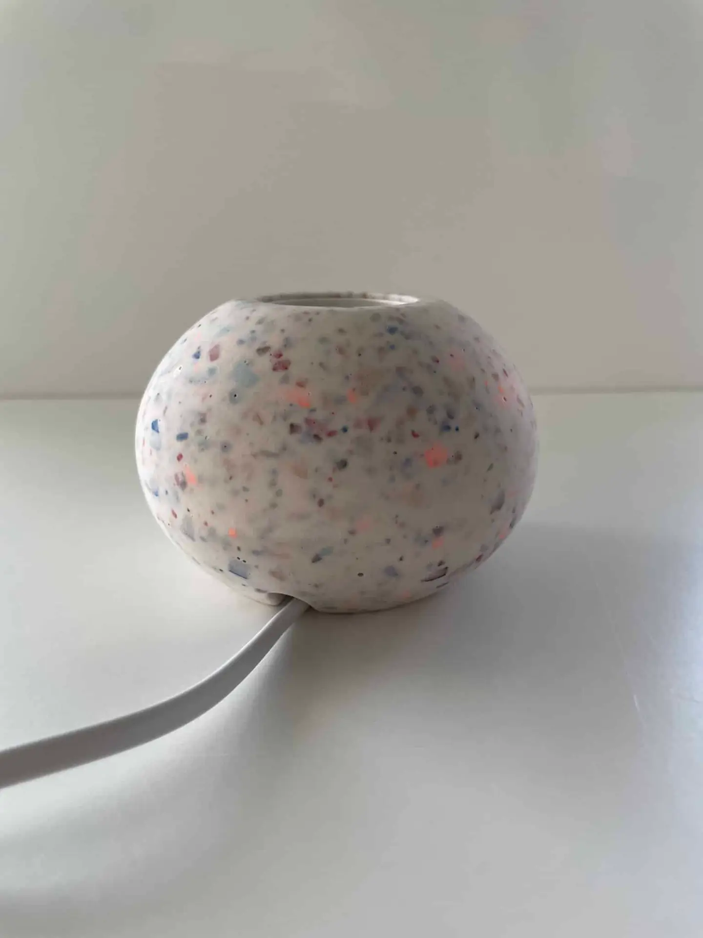 Farbe: weiß mit bunten Terrazzochips in den Farben neonorange, blau, weinrot, dunkelrot, schwarz, hellbraun, hellblau, royalblau
